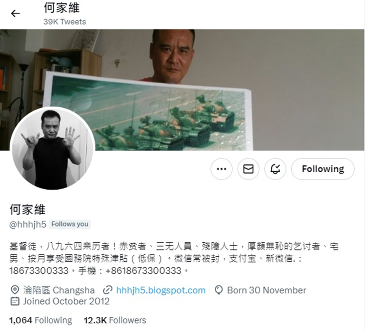 他是湖南株洲公民行动者、人权活动人士;多年来他一直坚持纪念六四,围观声援被捕的公民;他多次被拘留过。